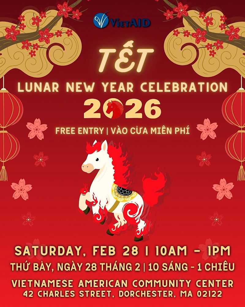28/2/2026: Mừng Tết Nguyên Đán 2026 tại Trung Tâm Cộng Đồng VietAID Posted on February 2, 2026February 2, 2026 by NT Thứ Bảy ngày 28 tháng 2 năm 2026 từ 10 giờ sáng đến 1 giờ chiều Trung tâm Cộng đồng VietAID 42 Charles Street, Dorchester, MA 02122 Vào cửa tự do