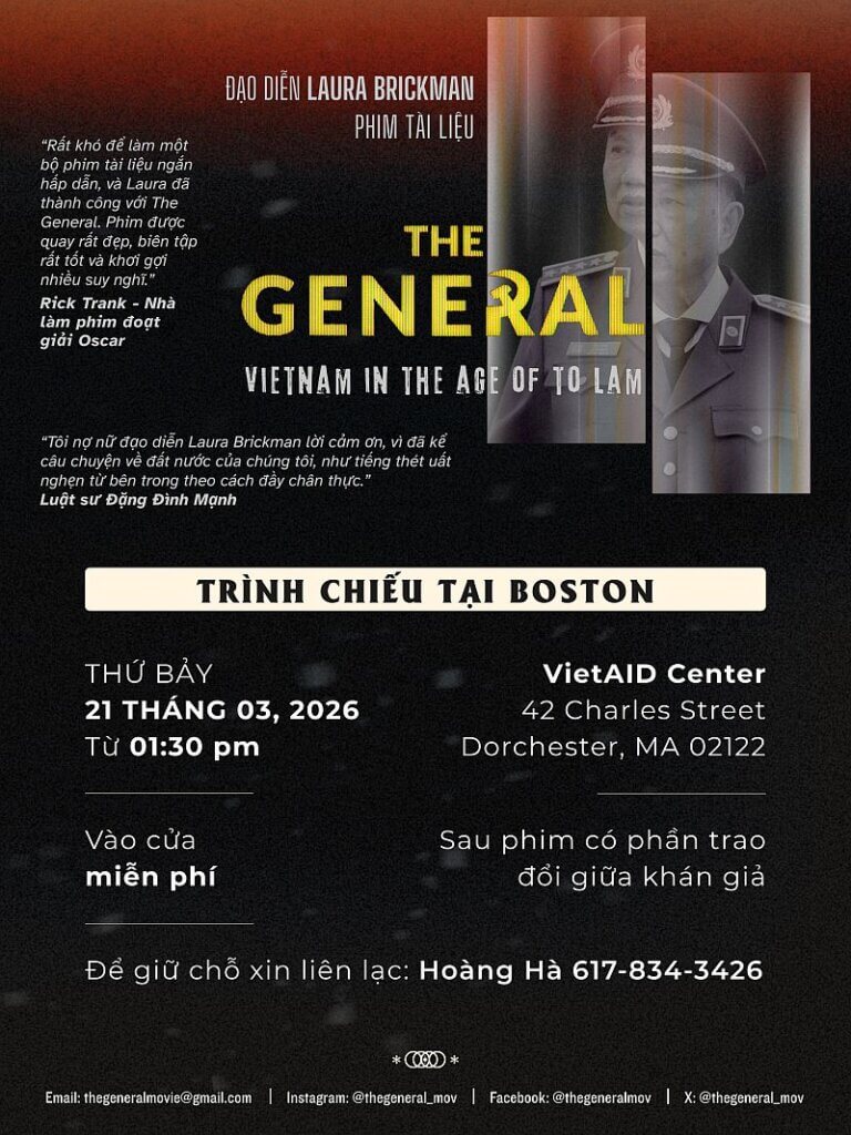 21/3/2026: Mời xem phim tài liệu – Đại Tướng: Việt Nam trong Thời kỳ Tô Lâm Posted on March 16, 2026March 16, 2026 by NT Trình chiếu: Thứ Bảy ngày 21 tháng 3 năm 2026 Giờ: Từ 1:30 giờ chiều Địa điểm: Trung tâm Cộng đồng VietAID, 42 Charles St., Dorchester Vào cửa Tự Do Liên lạc: Hoàng Hà: 617-834-3426 Kim Chi: 617-516-7837 Võ Nghi: 617-792-6944